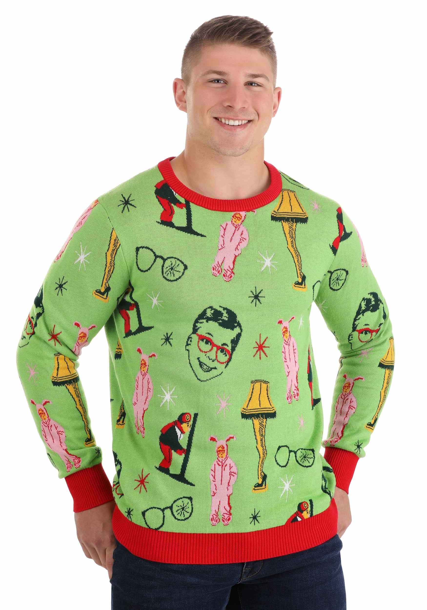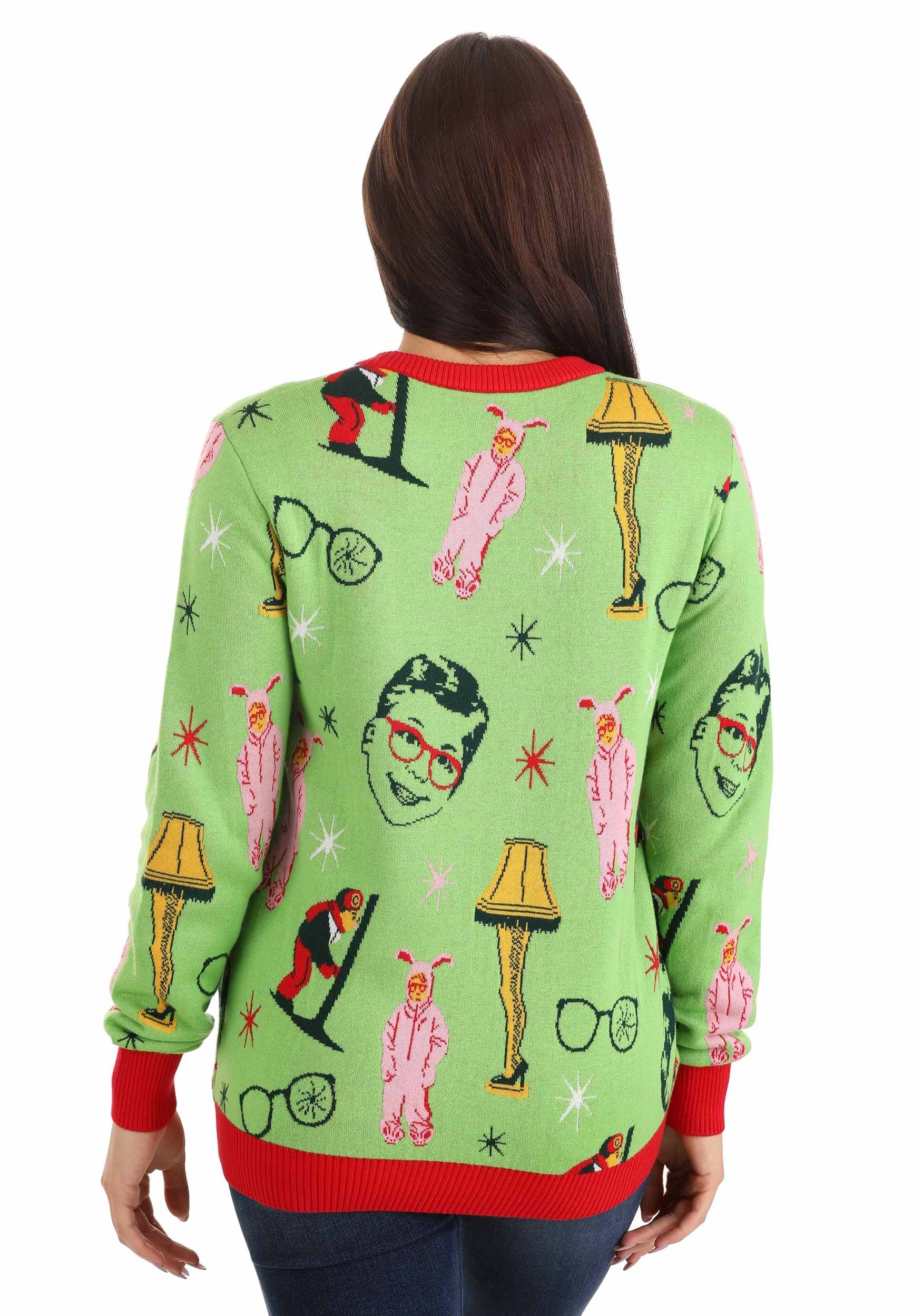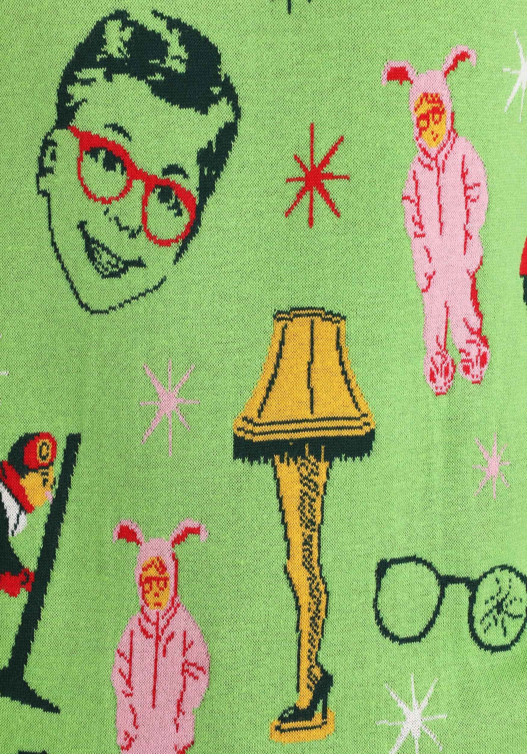 Warner Brothers officially licensed, our A Christmas Story Adult Ugly Sweater is authentic A Christmas Story apparel. An acrylic/cotton knit blend, it features knit-in images of those famous movie moments on a lime green background with a red rib-knit collar, cuffs, and waistband. A unisex fit makes it great for men and women, and particularly great for any A Christmas Story mega fan!