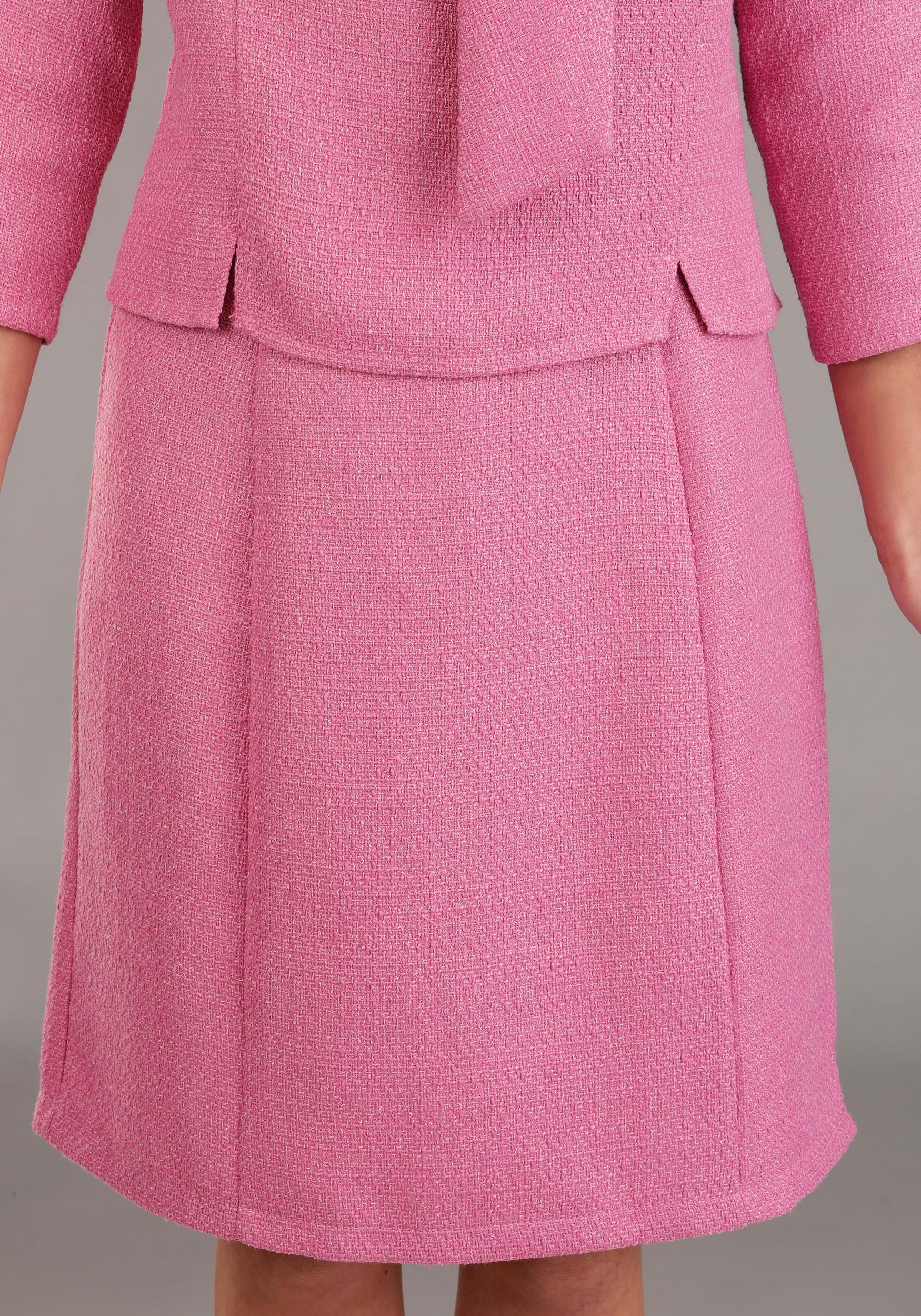 This officially licensed ensemble comes with a matching pink jacket, skirt, and pillbox-style hat. The jacket features three-quarter sleeves, a stylish attached necktie, and a clean, structured silhouette. A back zipper keeps the fit sleek while maintaining that iconic Elle polish. The coordinating skirt is designed with crisp seams and subtle pleating for a tailored, professional finish.