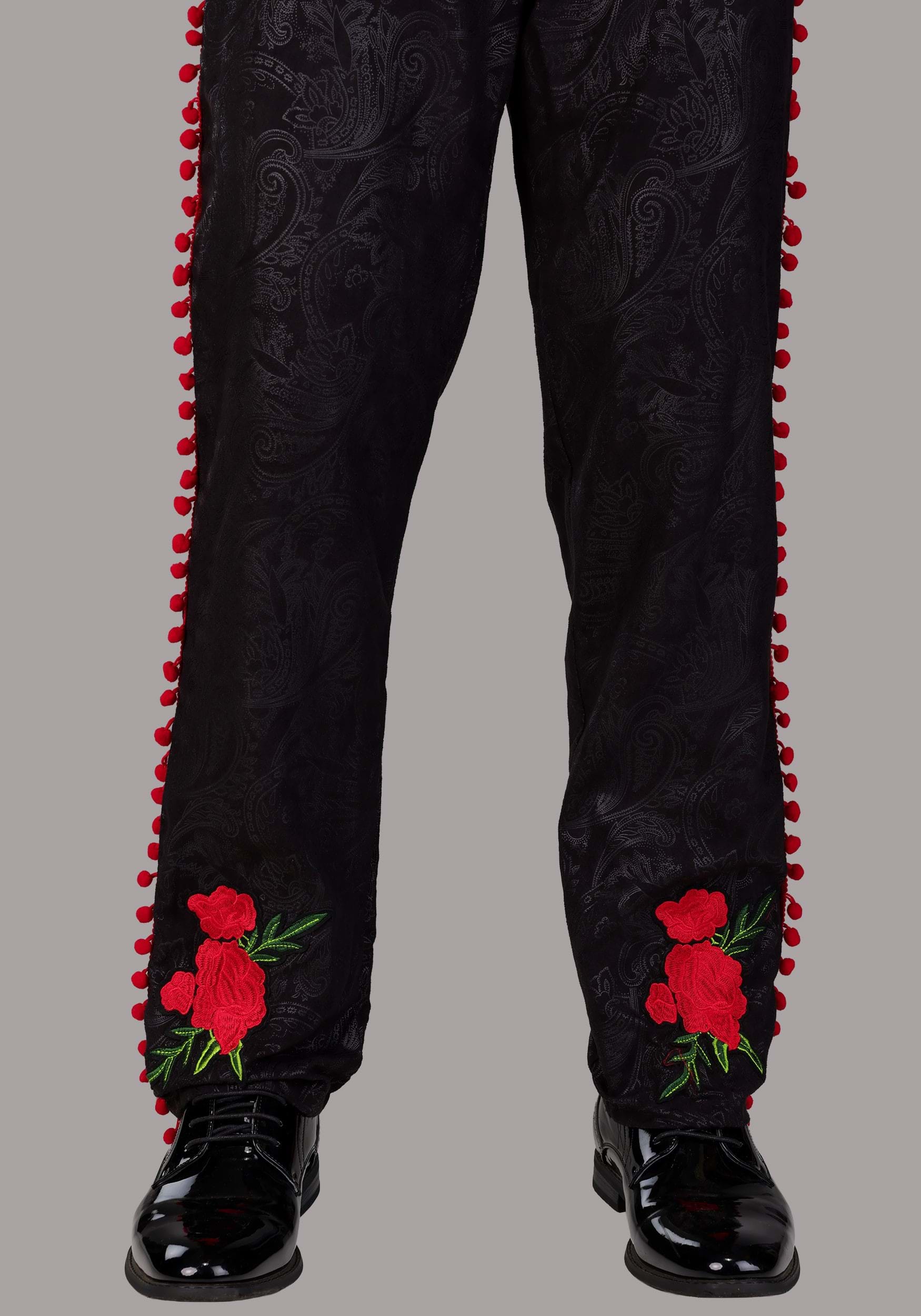 - Pants have ball fringe side stripes, embroidered rose above each cuff