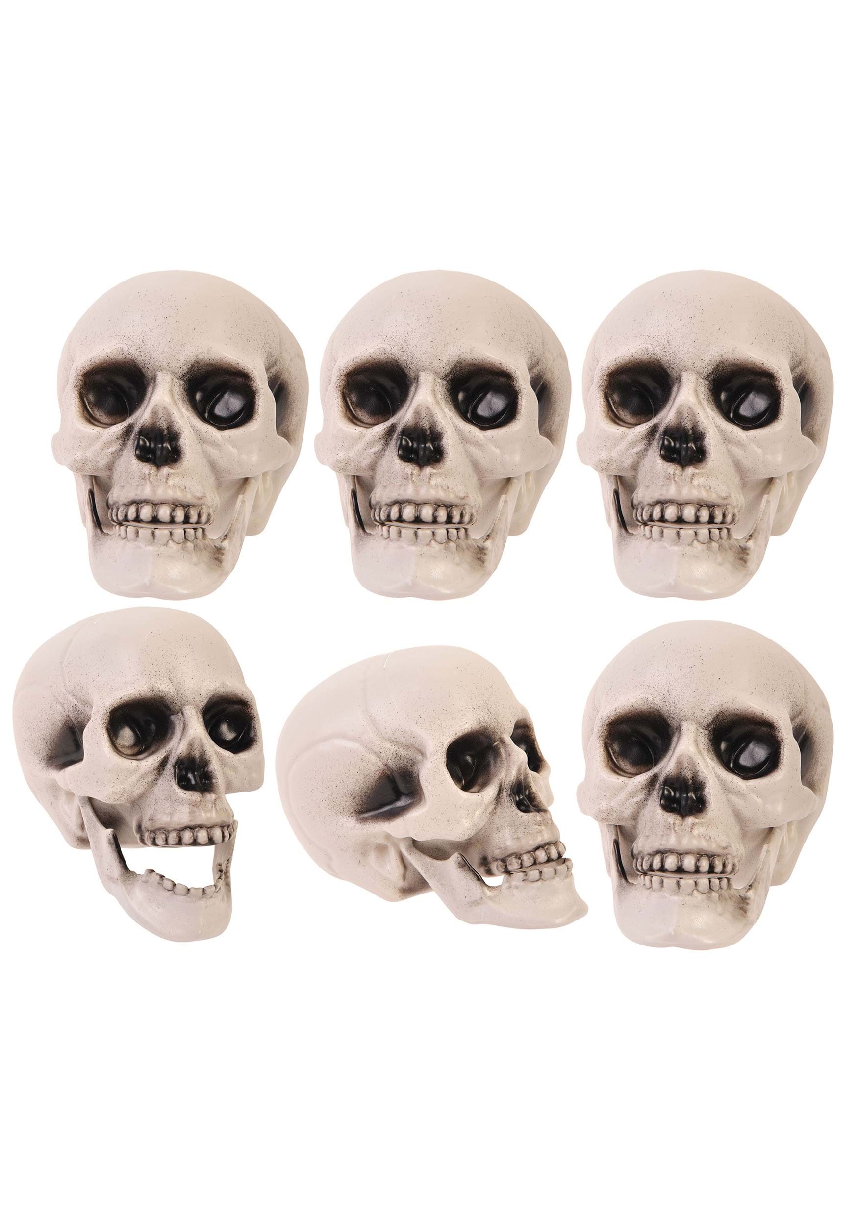 Each skull in the set is made of molded plastic with a distressed, aged finish that gives them that freshly-unearthed look. The jaws are designed to move slightly when handled, so they add a touch of realism—or at least enough to make your guests do a double-take. Perfect for scattering across tabletops, stacking in corners, or dramatically spilling out of cauldrons.