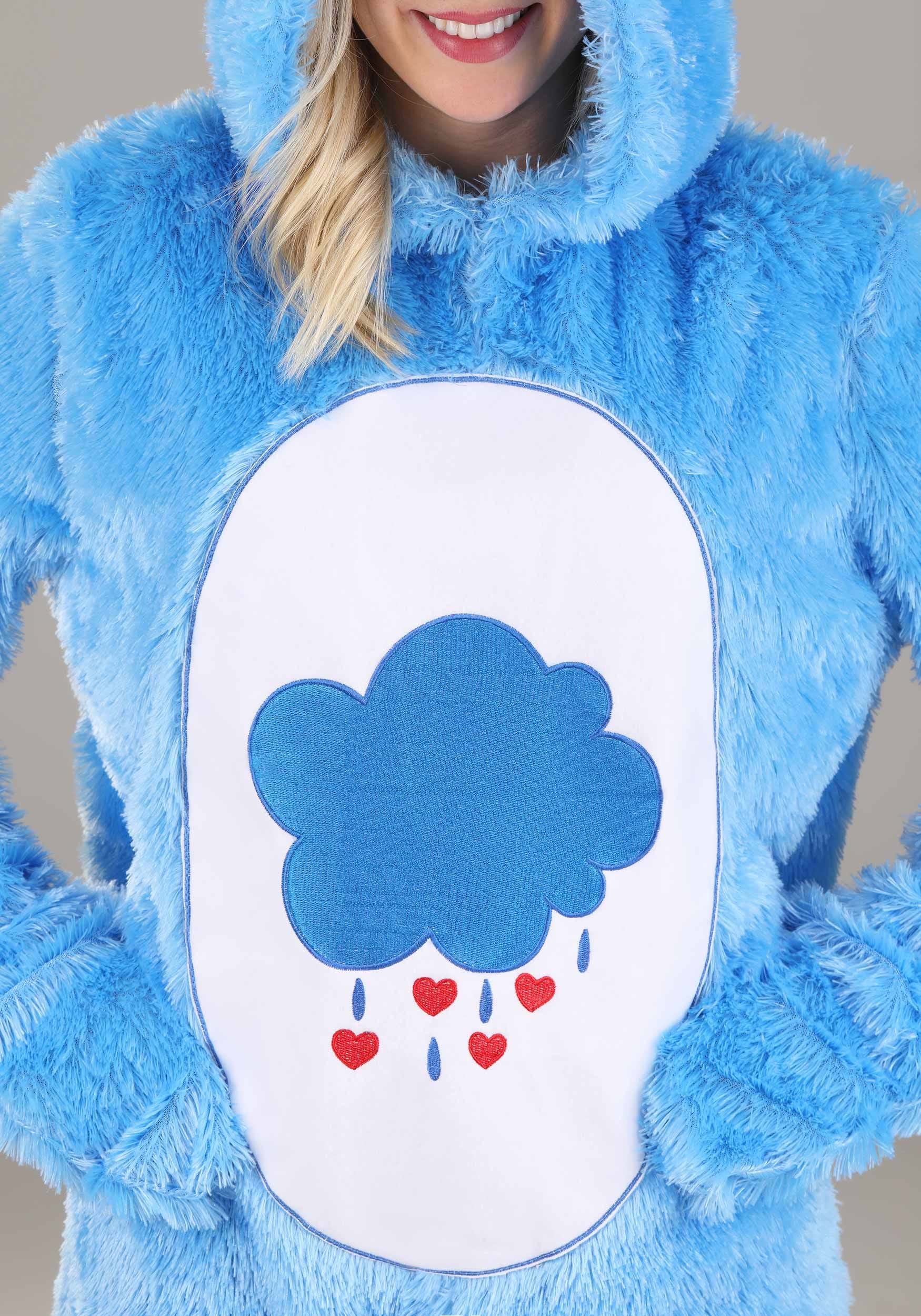 This officially licensed Care Bears costume includes a blue hooded jumpsuit made of 100% polyester faux fur—soft enough to nap in, dramatic enough to storm off in. It zips up the back, so getting in and out doesn’t require a full support team. The signature belly badge is appliqued on the front (blue cloud with raindrop hearts, obviously), and the Care Bears logo is on the back for the true fans.
