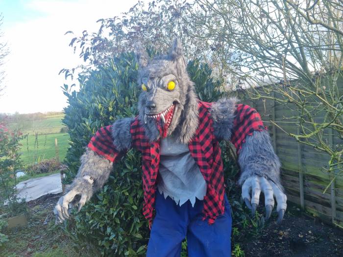 This werewolf is awesome! He has a lot of motion being how he leans over, mouth moves, and head turns side to side. When he is activated all motions move at once which makes him very lifelike. The face is very detailed which is great. The clothing feels quite nice quailty. The welding and framework is also fantastic, I can see it lasting a while.