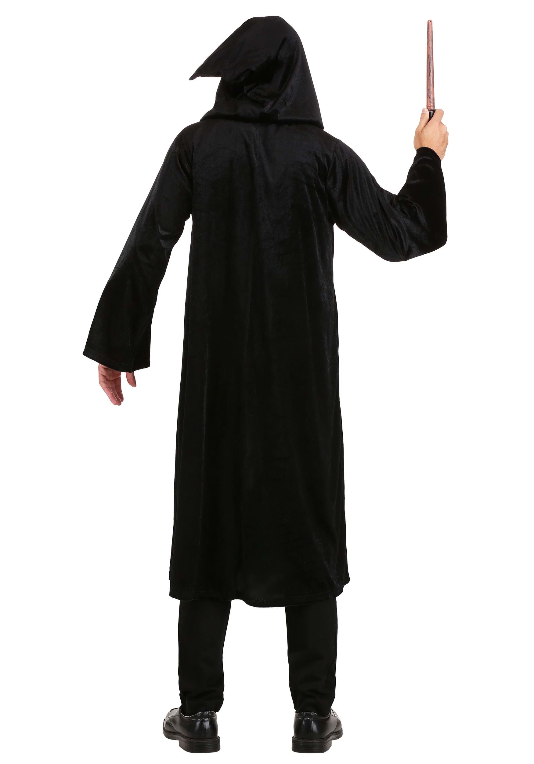 This is a black robe of velour fabric that features satin trim and lining in the hood. (The elegance here might make Madam Malkin just a hair jealous.) The iconic Slytherin crest is embroidered over your heart to complete this robe's magic. Finish off with your favorite wizarding world accessories for a seriously ambitious look.