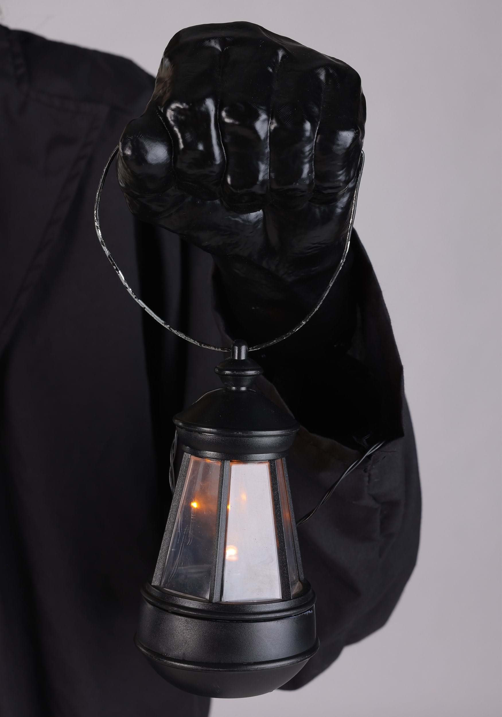Standing an imposing 6 feet tall, the Ghastly Gravedigger comes equipped with a metal stand, polyester cloak, and a face only a cemetery could love. His head turns side to side while his lantern and eerie white eyes glow in sync. His mouth moves as he delivers spine-tingling lines like, "Do you not see where you walk?" You know, lines that are just perfectly designed to spooking guests and mail carriers.
