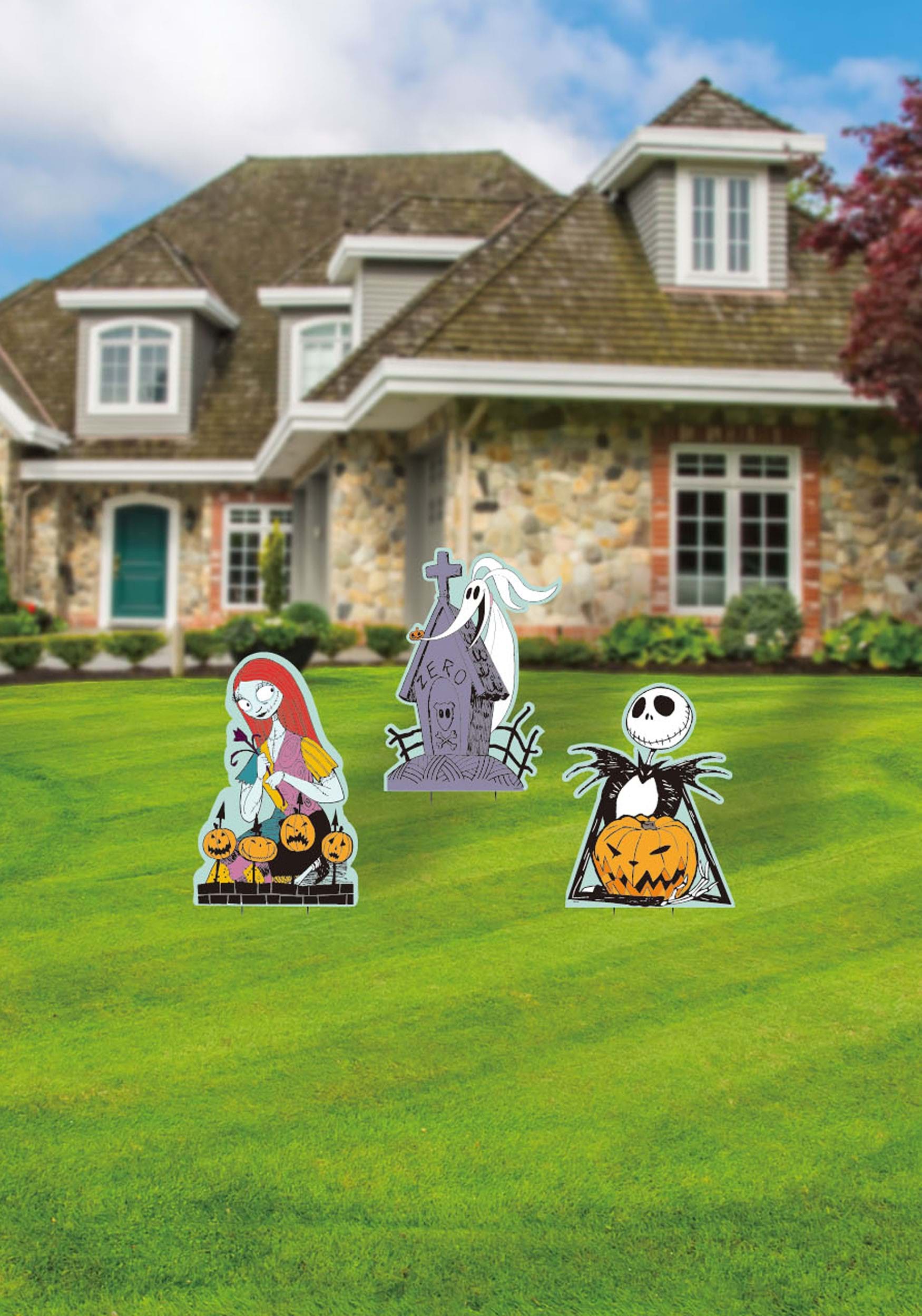 This three-piece yard sign set features fan favorites Jack Skellington, Sally, and Zero with his signature ghostly doghouse. Each character is printed in full color with artwork inspired by their classic movie designs—Jack with his jack-o’-lantern, Sally surrounded by pumpkins, and Zero peeking out of a purple tombstone-style doghouse.