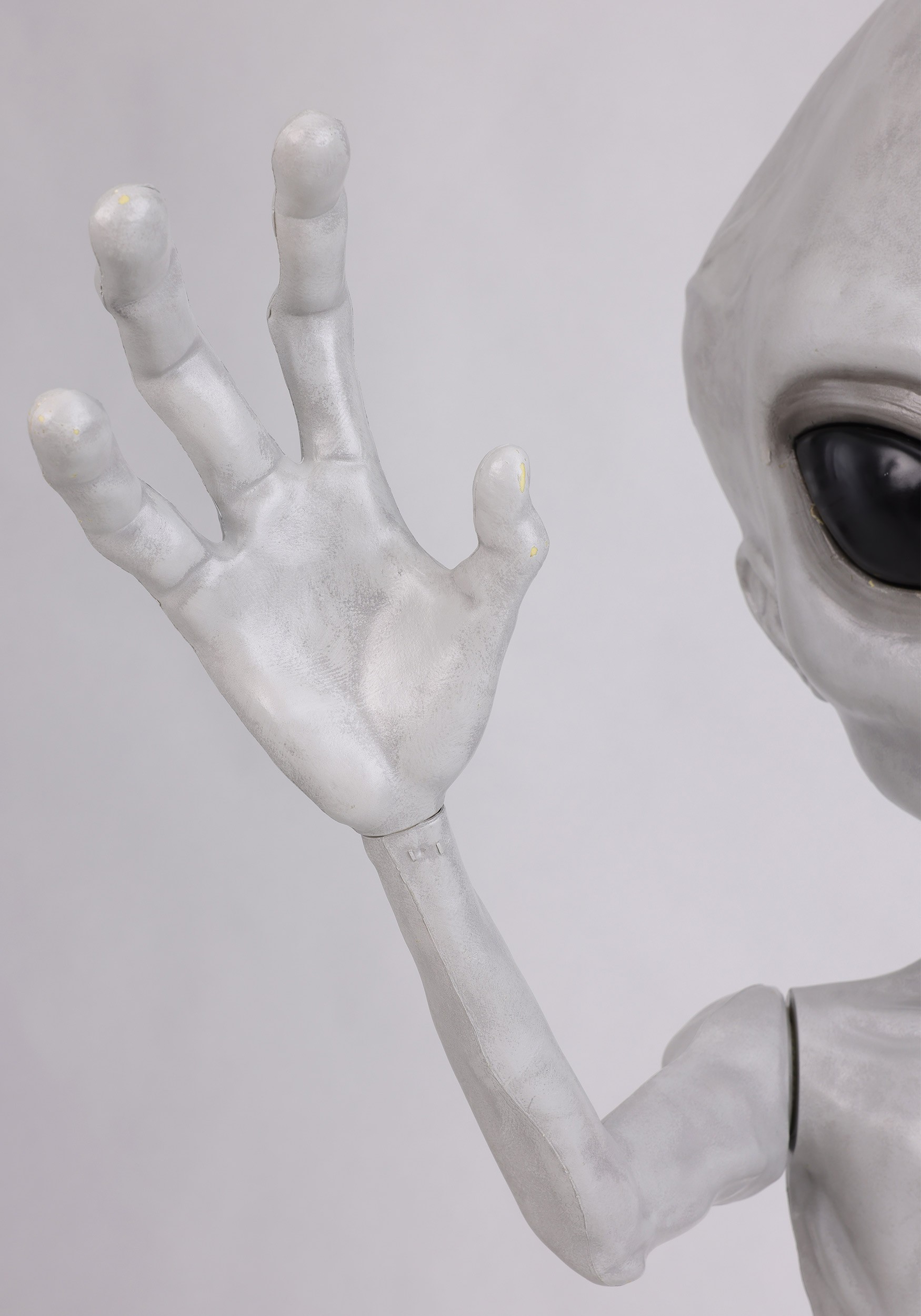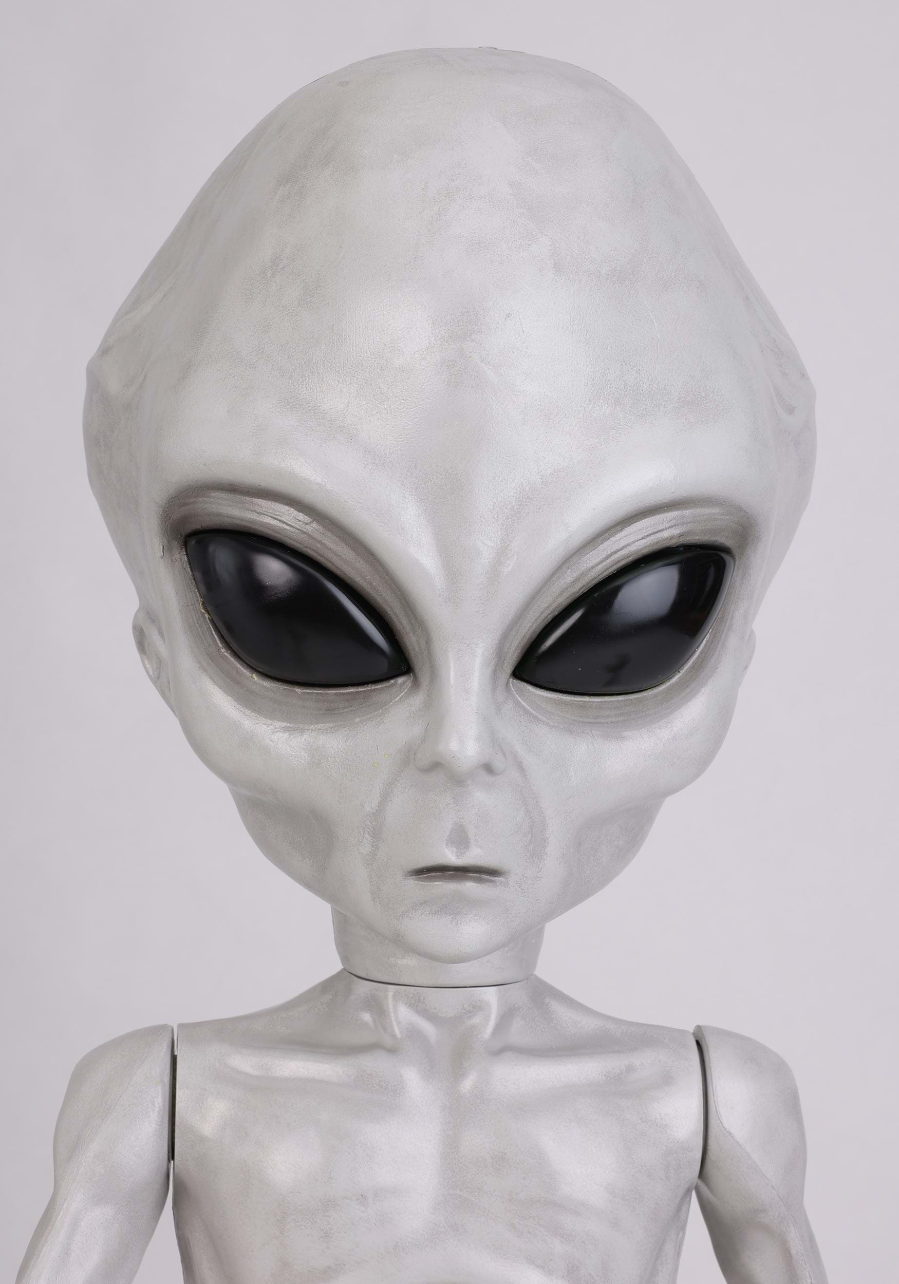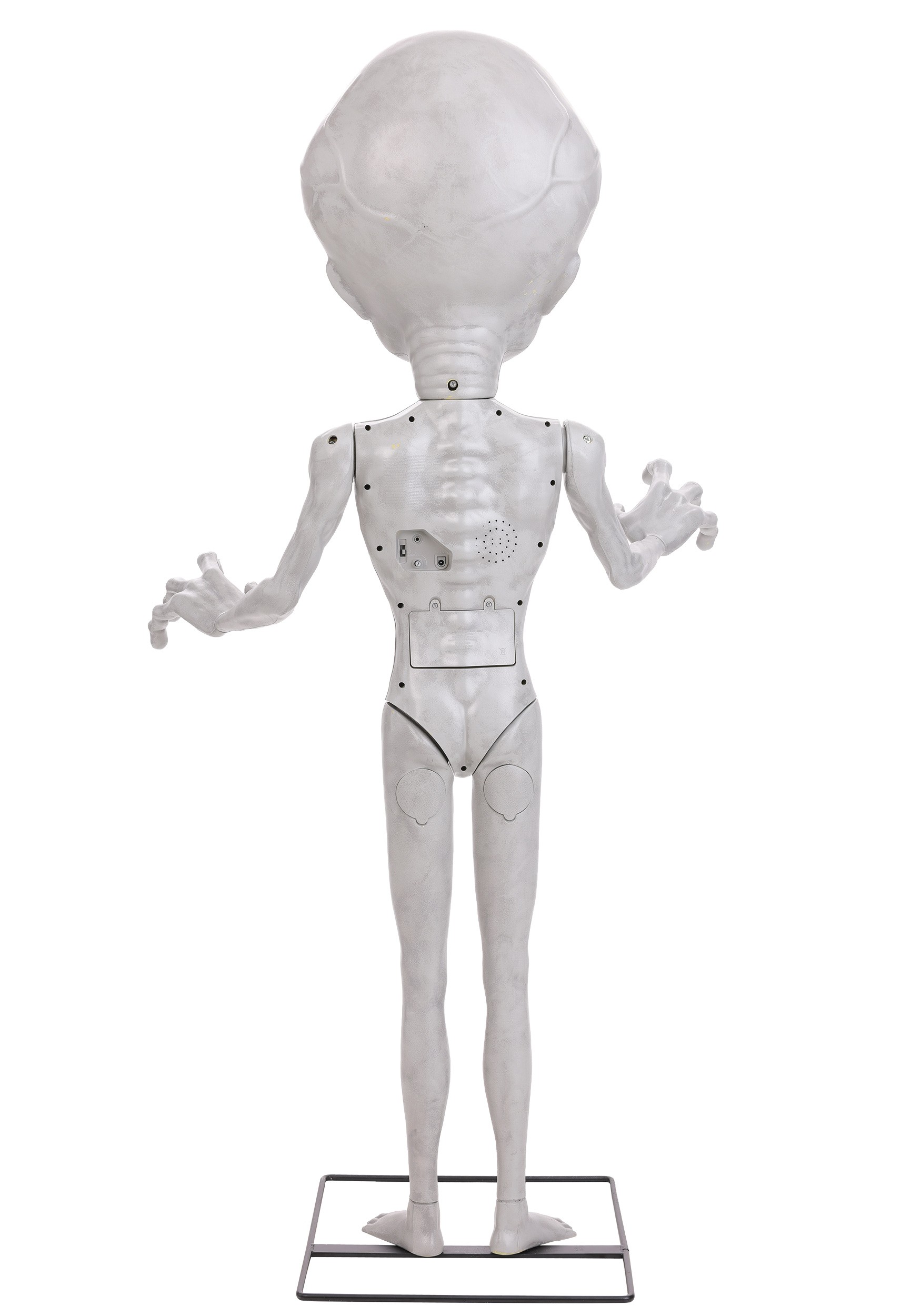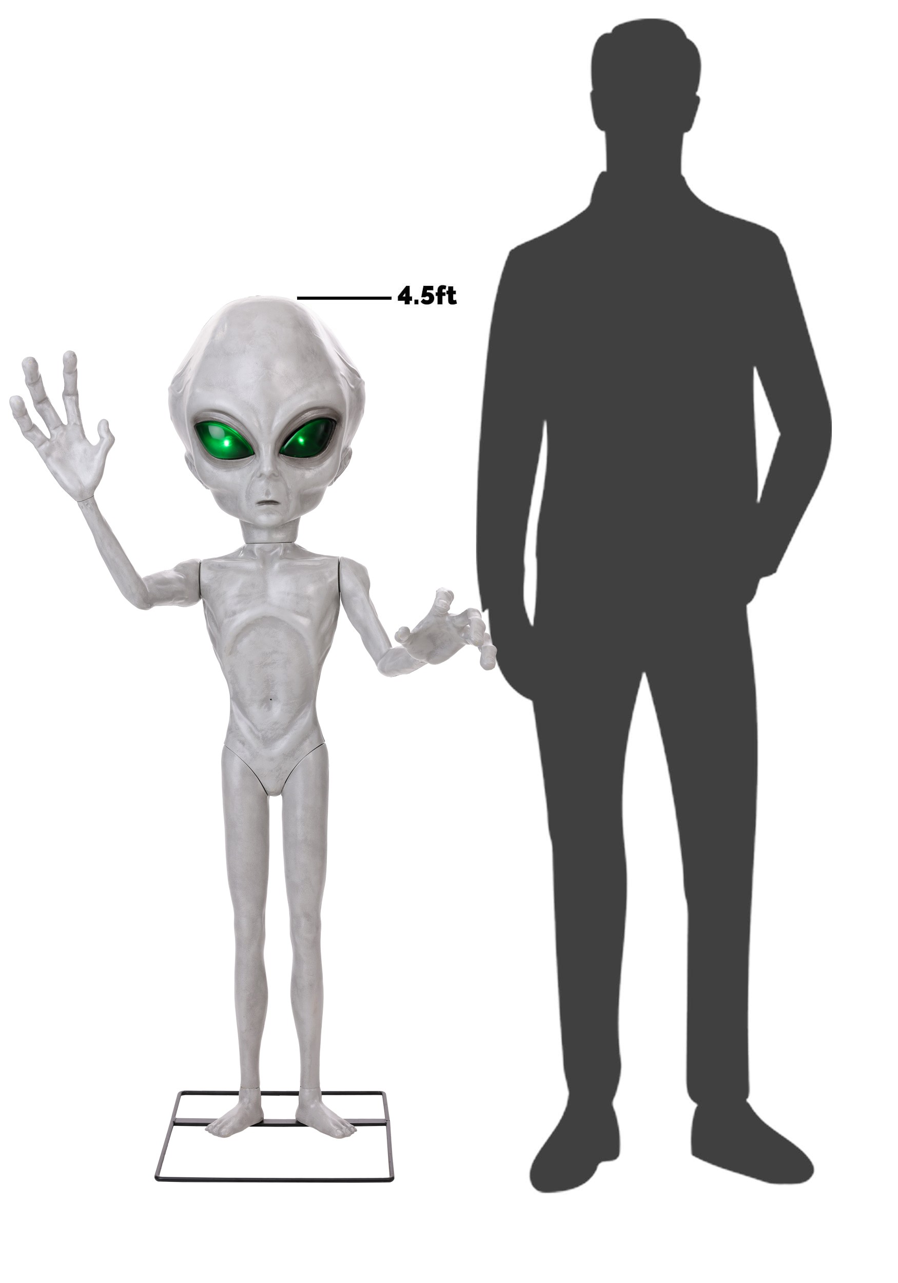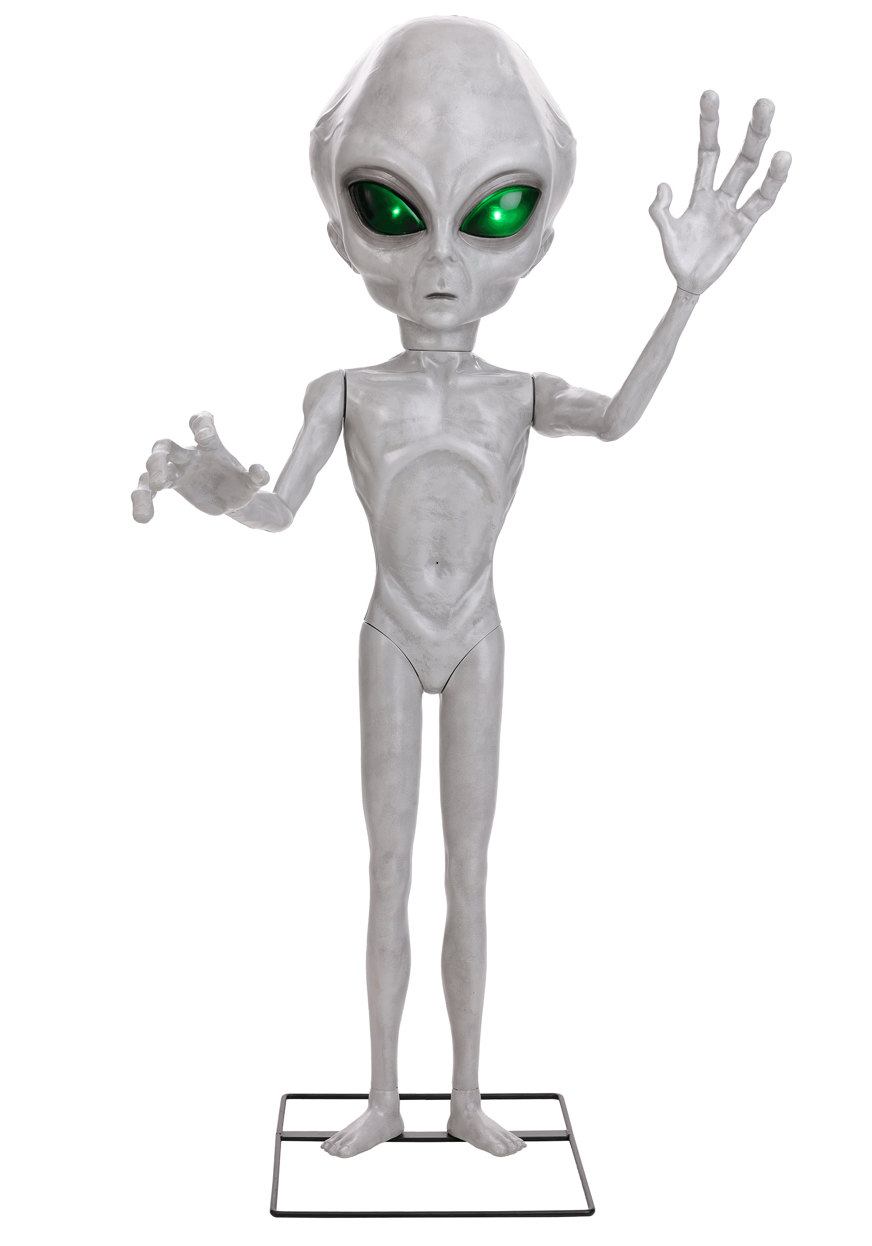 This animatronic decoration features a molded plastic alien body mounted securely on a metal stand, giving it a stable presence at an oddly adorable 4'6" tall. The eyes light up green, the head moves side to side, and the arms are posable, letting you adjust his stance for maximum extraterrestrial awkwardness.