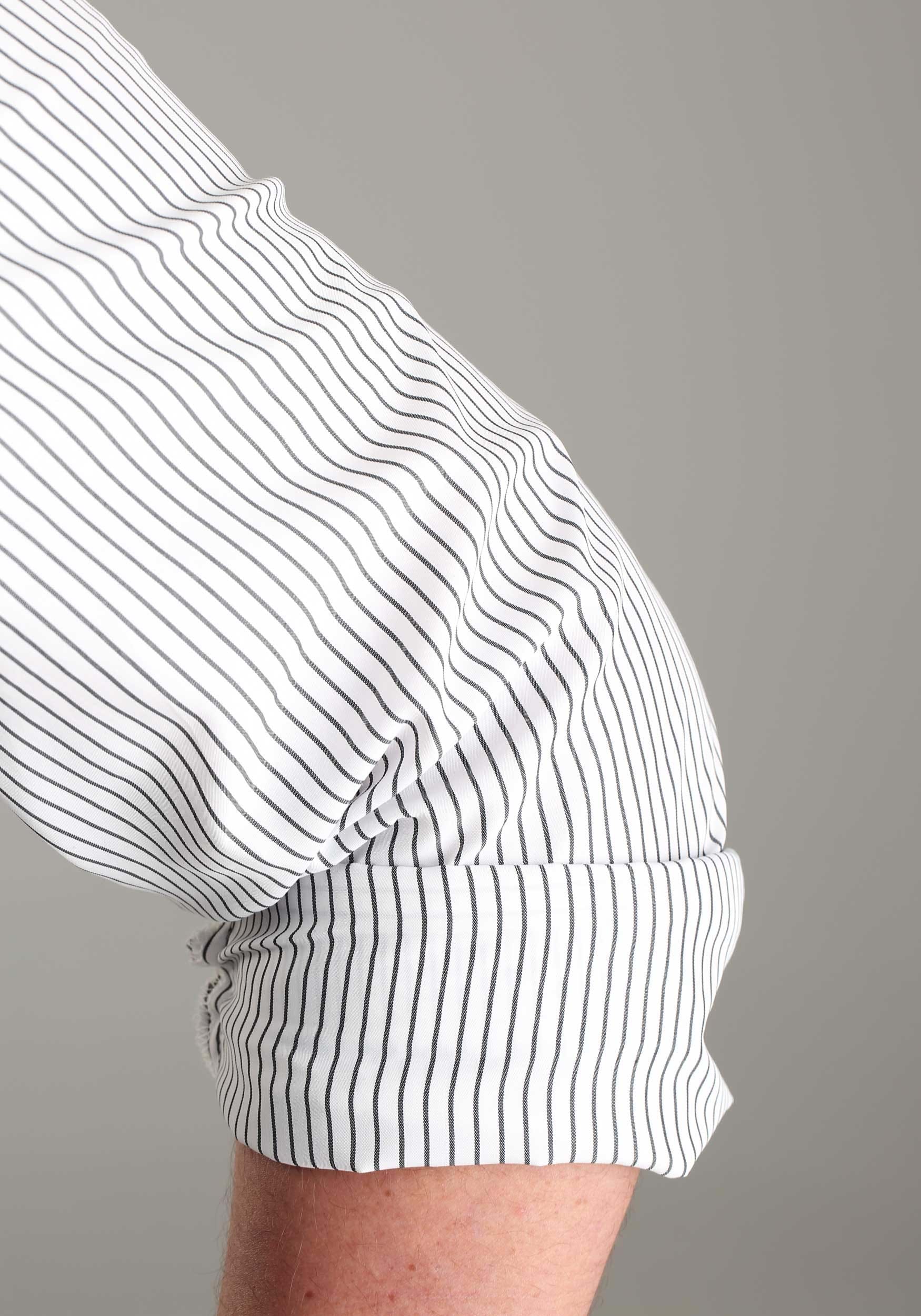 - Pinstriped broadcloth shirt has buttons at front and at sleeve cuffs