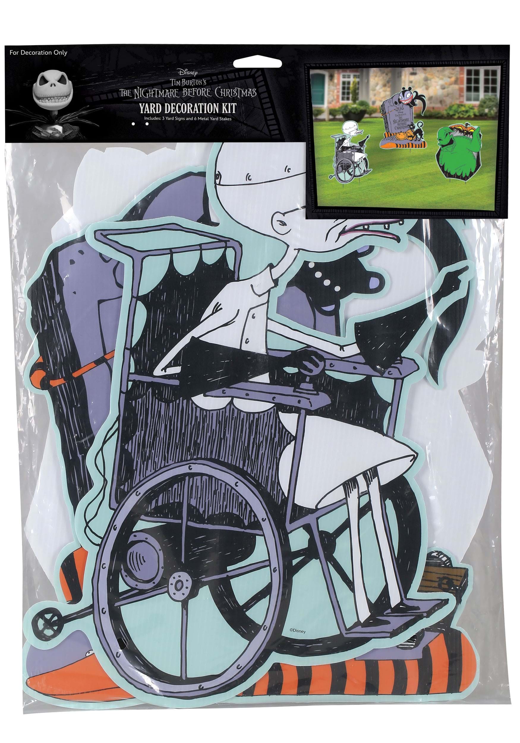 This officially licensed three-piece kit features vibrant yard signs of Oogie Boogie in all his green glory, Dr. Finkelstein rolling in with his signature scowl, and a themed tombstone with creepy crawlies and classic Nightmare Before Christmas flair. Each character is printed in bold detail, bringing the weird and wonderful vibes of Halloween Town straight to your garden, lawn, or walkway.