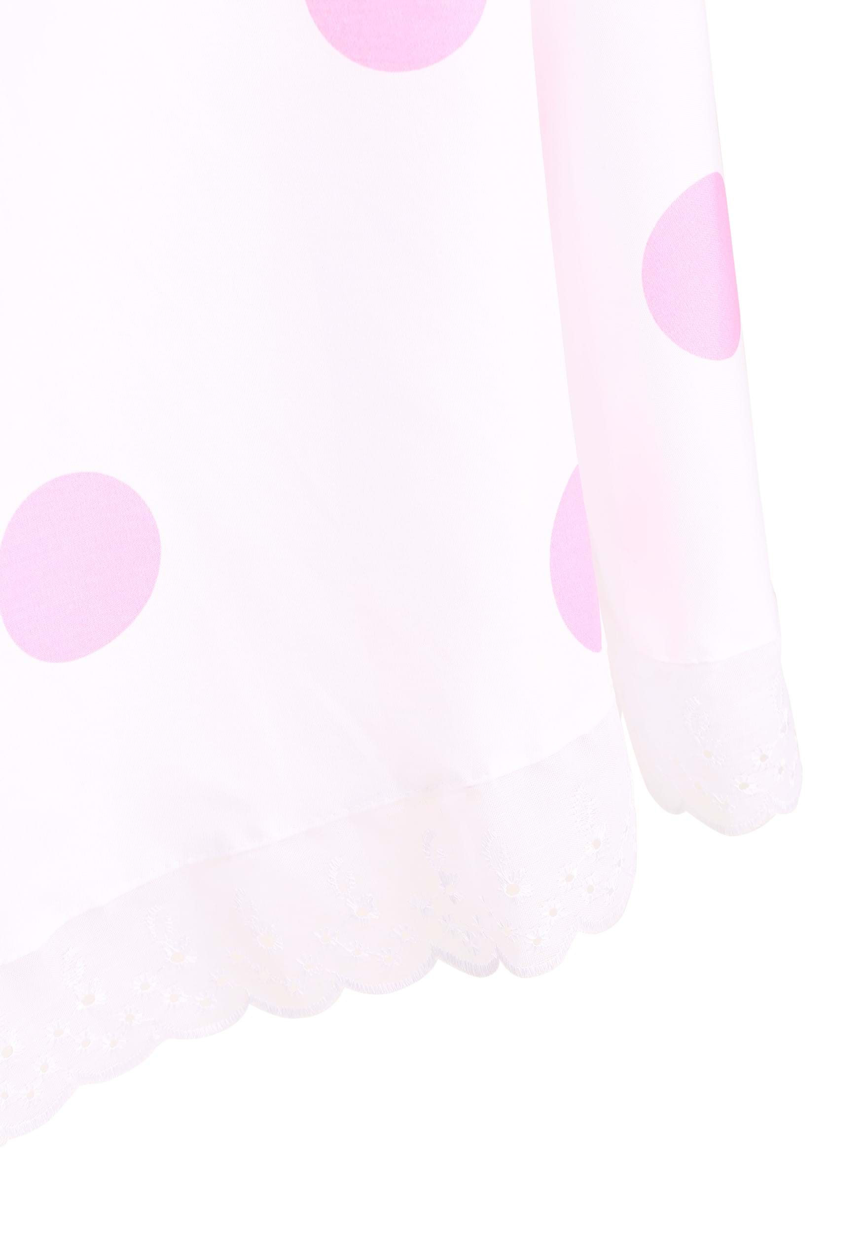 The pink and white dress zips up the back and features a twill bodice with short puffed sleeves and a built-in petticoat for a little extra swish. The upper skirt is trimmed with sheer layers of chiffon and tulle, while the white poplin skirt below is covered in bold pink polka dots and finished with delicate eyelet lace at the hem. It’s got just the right amount of volume and structure for parades, parties, or dramatic glances over the shoulder.